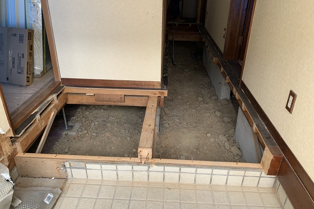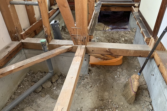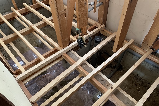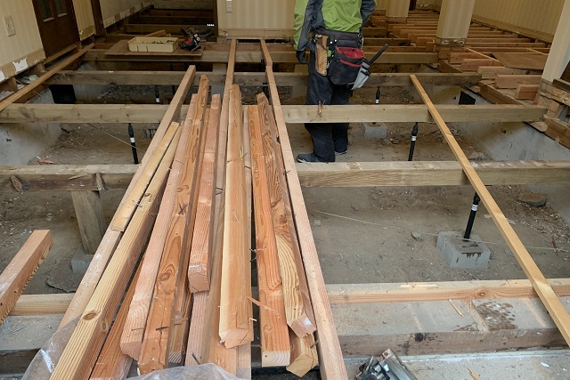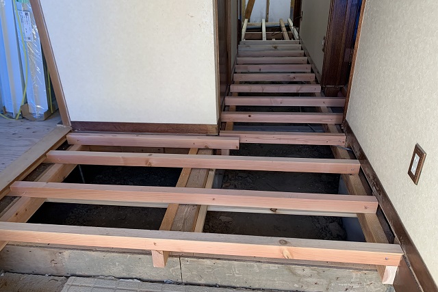 既存の床材を撤去し、断熱材を入れるために根太を組みました。