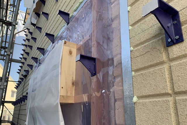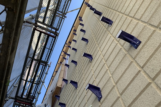 外壁に断熱材を外張りしていくためのフックが、等間隔にビス止めされています。「KMブラケット」と言いまして、ポリカーボネートで高強度&劣化しにくい素材です。