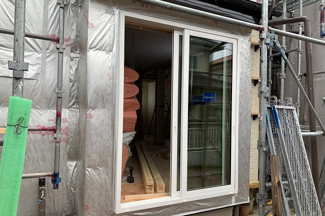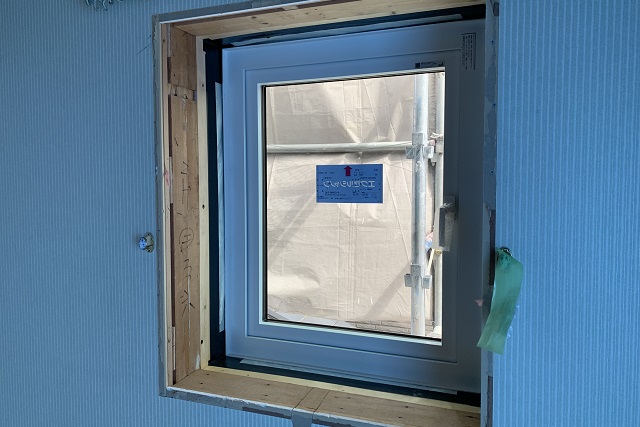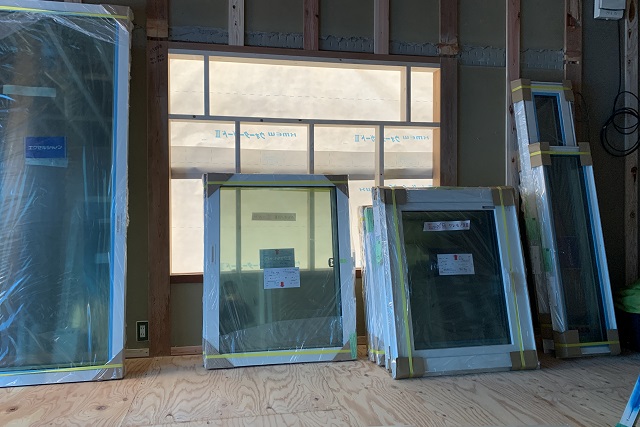 各開口部に樹脂サッシが取り付けられ、室内側の壁にもグラスウールが埋め込まれました。