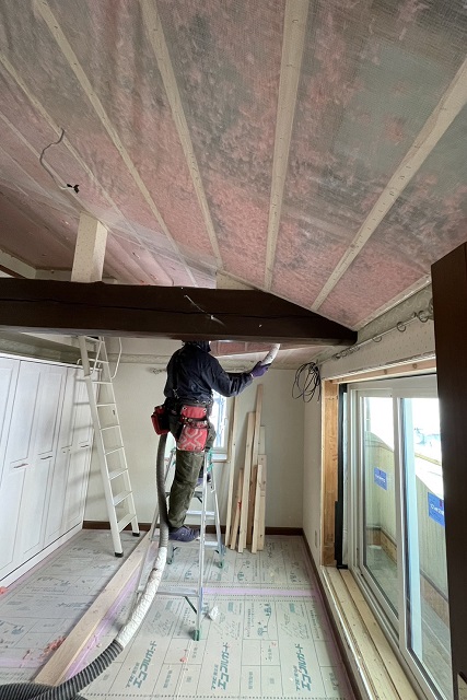 さらに居室側の天井にも気密シートを張り、隙間風を通さないようテーピングしている点も要チェック。