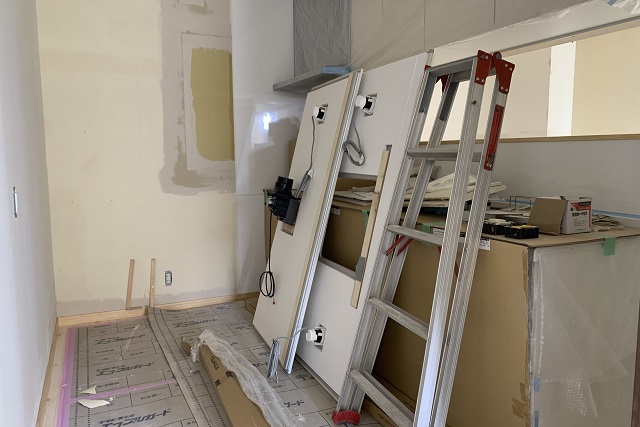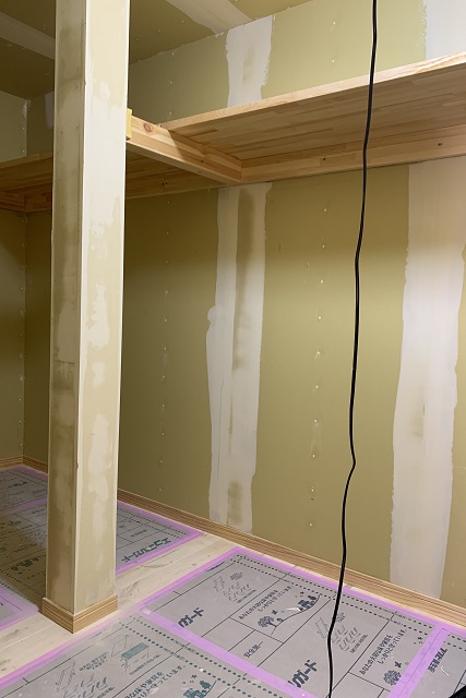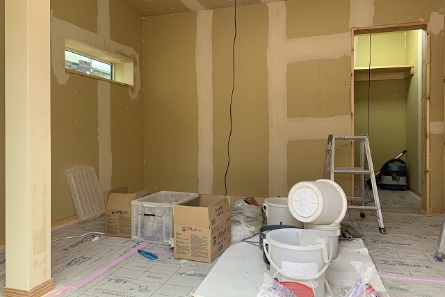 水回り機器が入り始め、内装工事も本格化。壁に石膏ボードを張り、表面の凹凸を平らにするためパテ埋めしていきます。