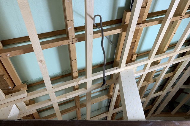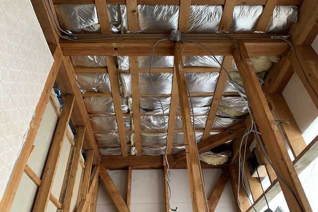 既存の天井も落とし、垂木を組みました。天井裏にも断熱材を入れる予定ですが、こちらは吹き込み用の綿菓子のようなものを注入します。