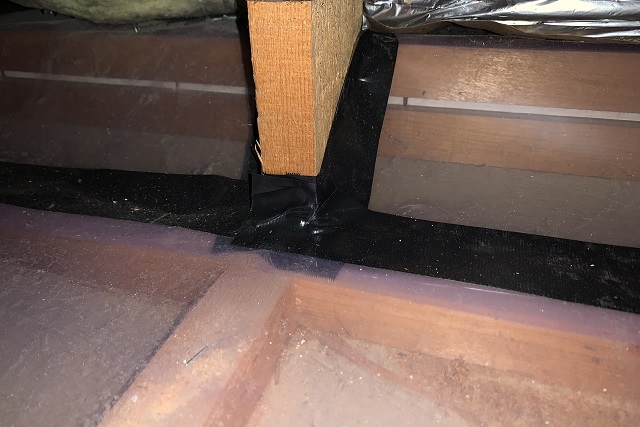 天井裏に気密シートを張り、テープで「気流止め」することで冷気が隙間を流れないようにしています。