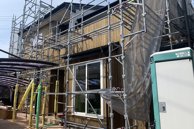 注目の一つは、木板張りの外壁です。まだ足場が掛かっているのでフルオープンではありませんが、とってもウッディな感じでしょう?
