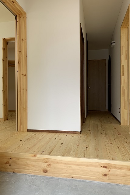 1階の床は、節が特徴的なパイン無垢フローリング。やわらかい素材で、素足で歩いたときの肌触り感が良いんですよ。ぜひ内覧に来て、触れてみていただきたく。