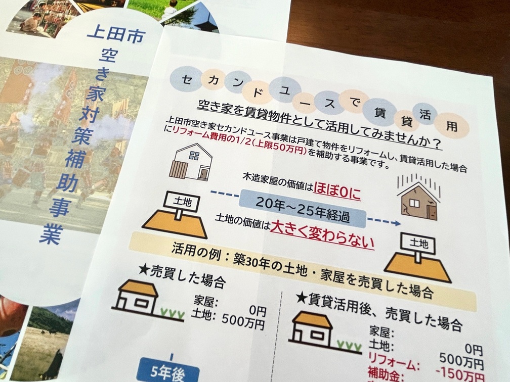 上田市内空き家をリフォームし、賃貸活用する場合、工事費の1/2補助(上限50万円)そうです。